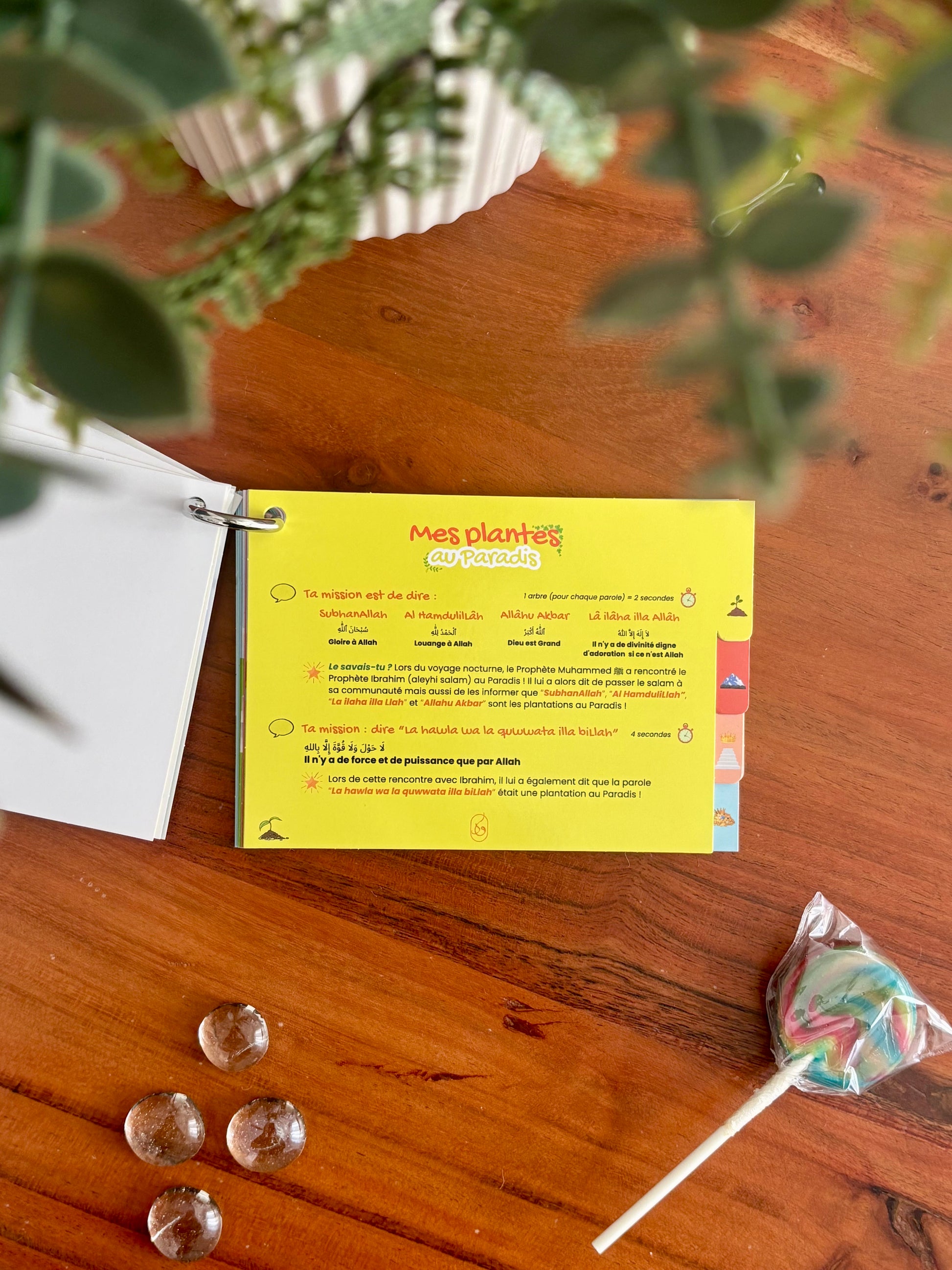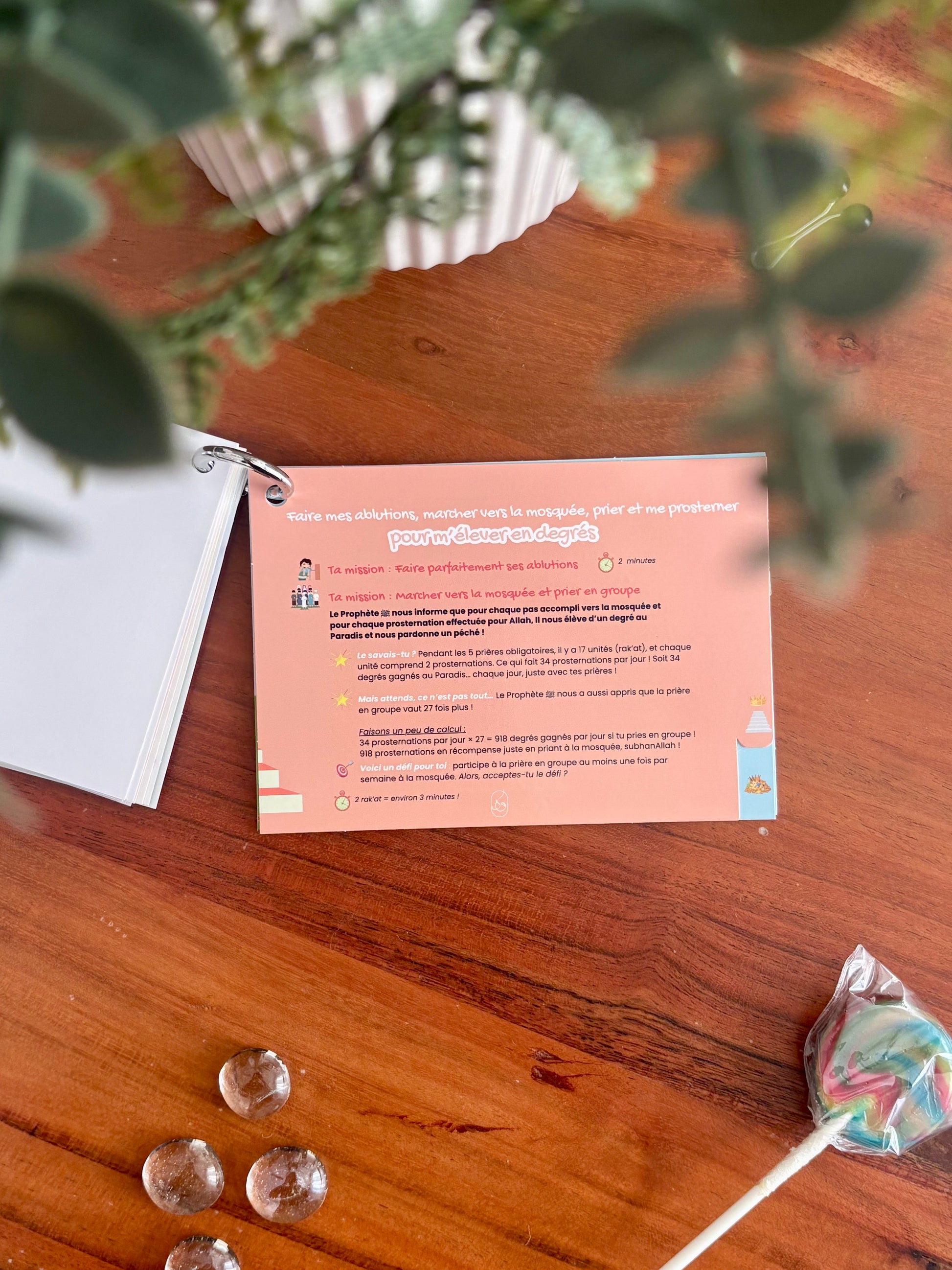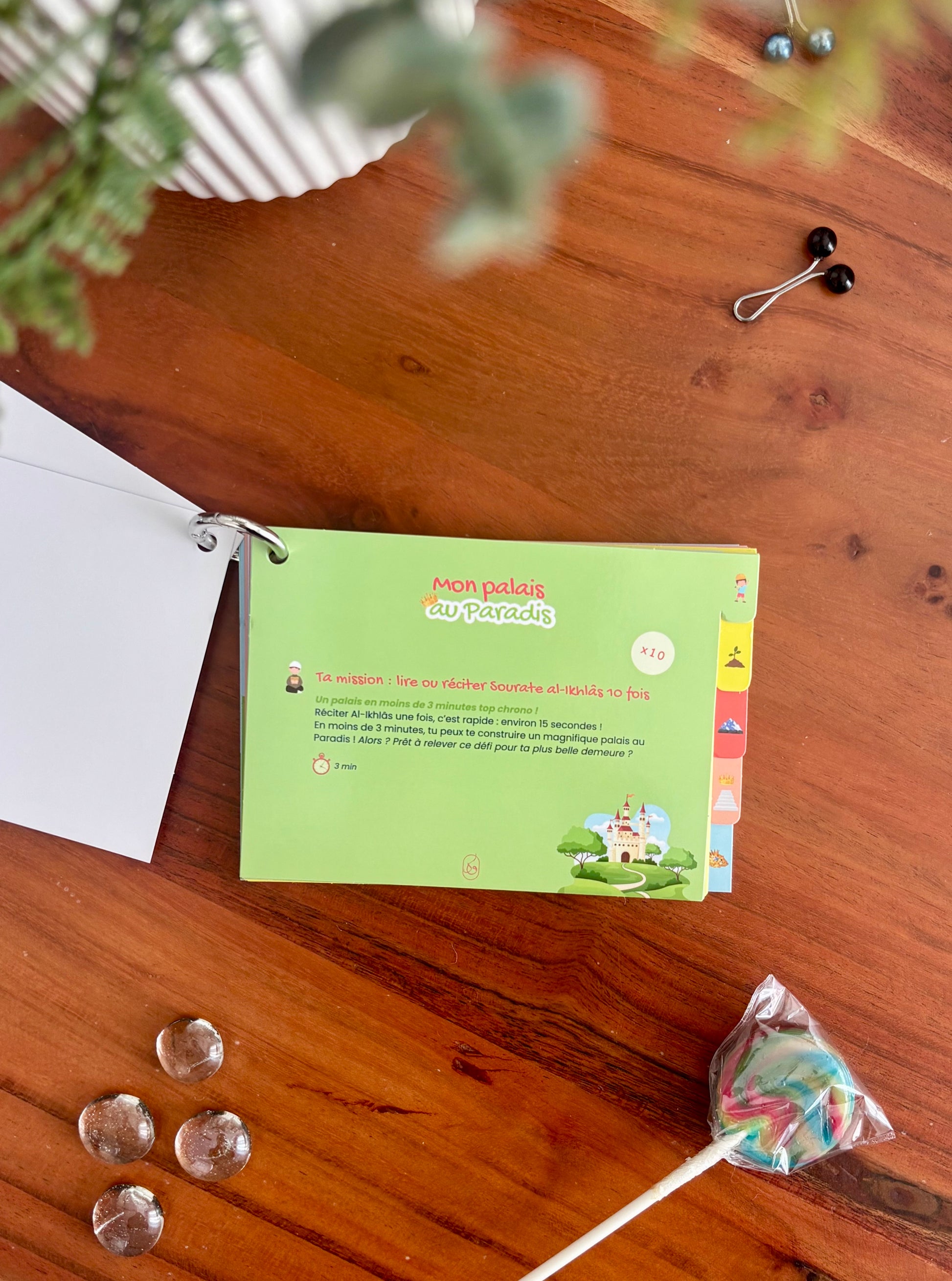 - Missions chronométrées ⏱️ : des actions simples transformées en mini-défis amusants. Exemple : réciter Sourate al-Ikhlâs 10 fois en moins de 3 minutes pour construire un palais au Paradis