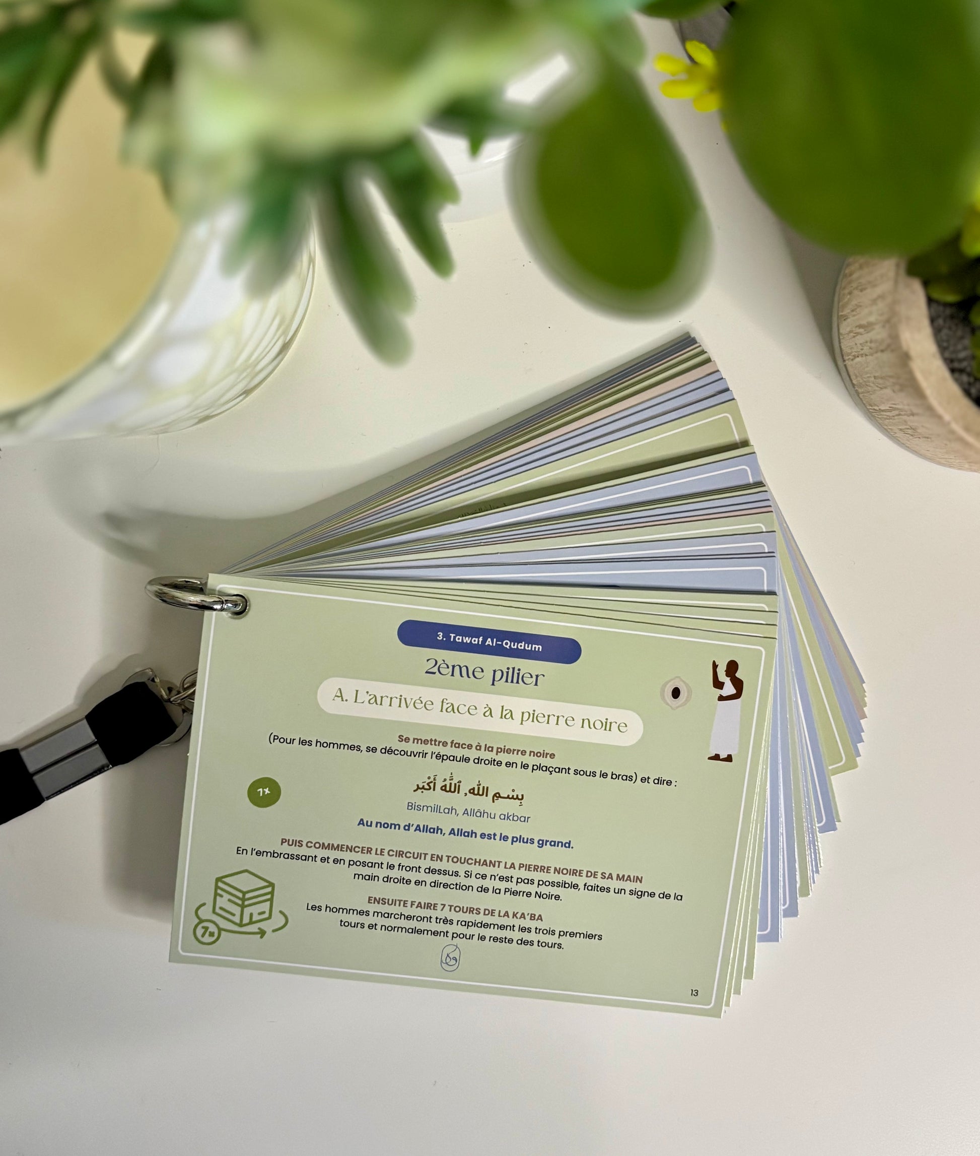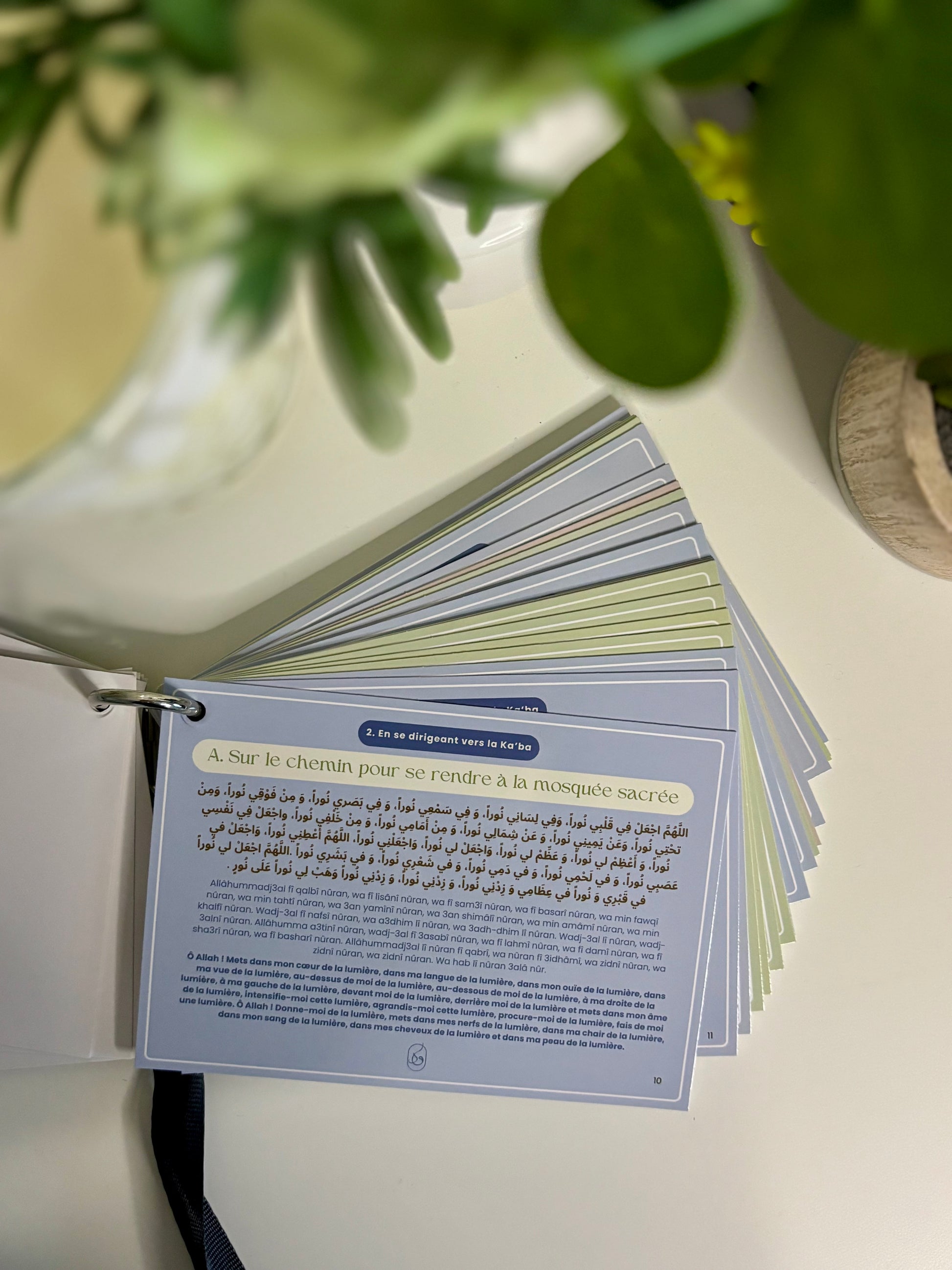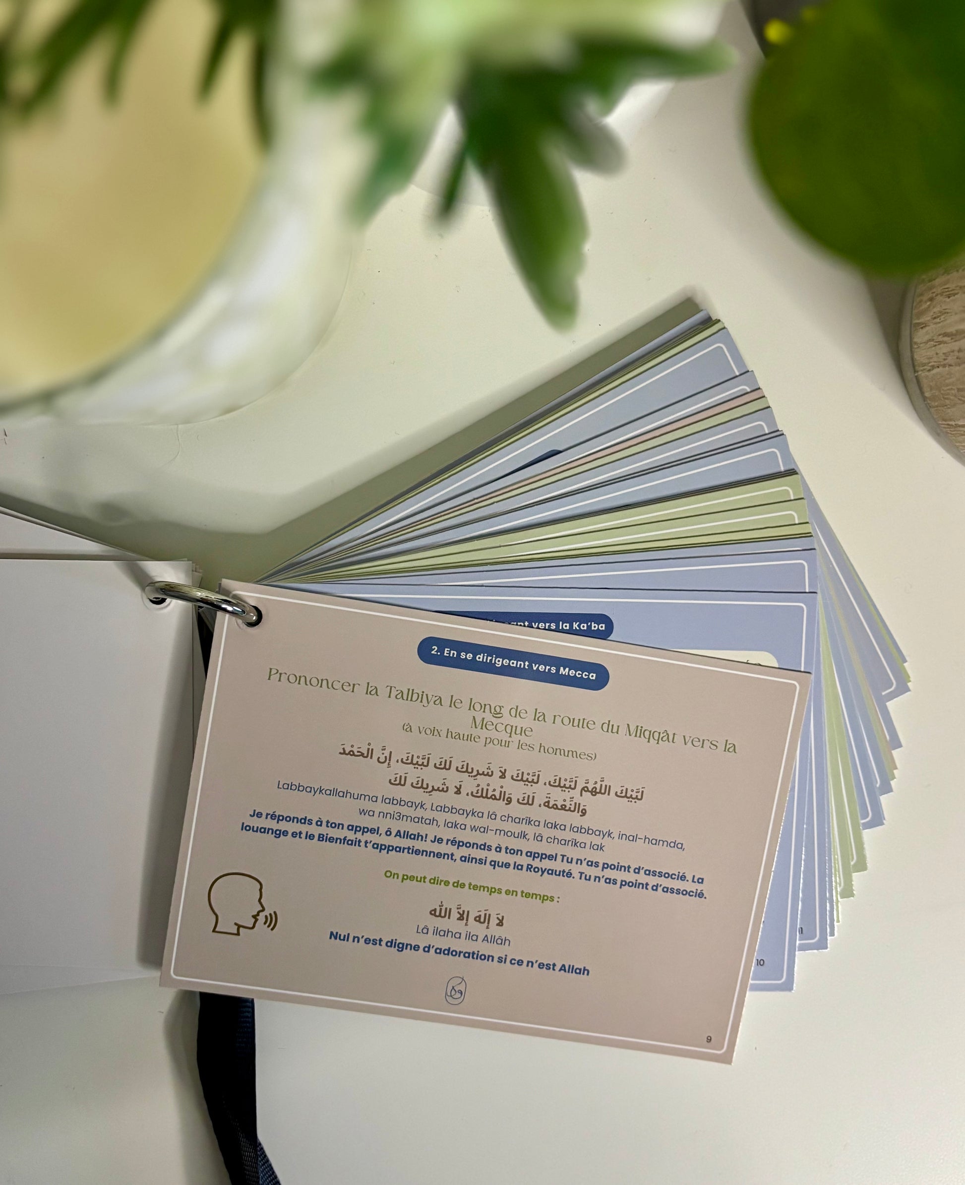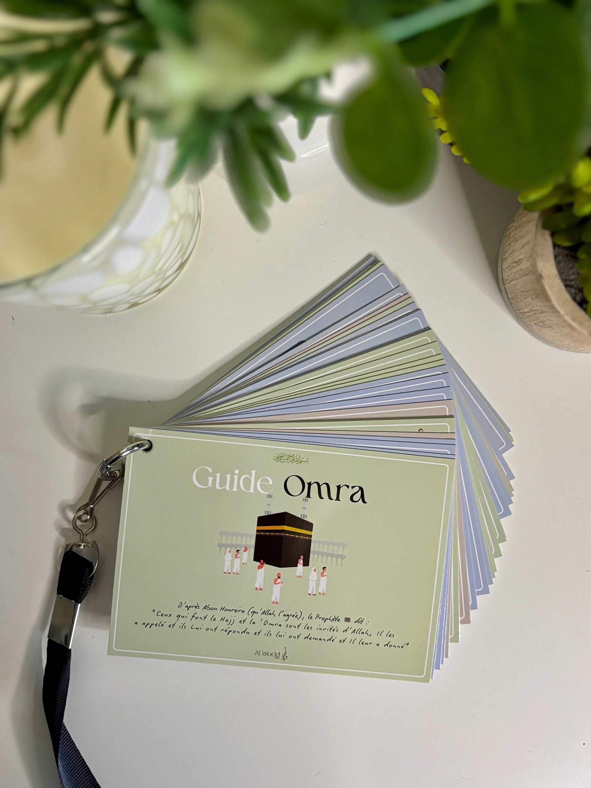 - Un ensemble complet d'invocations organisées par thème et par couleur pour chaque étape de votre voyage sacré, depuis votre départ de chez vous jusqu'à votre retour de la Omra.