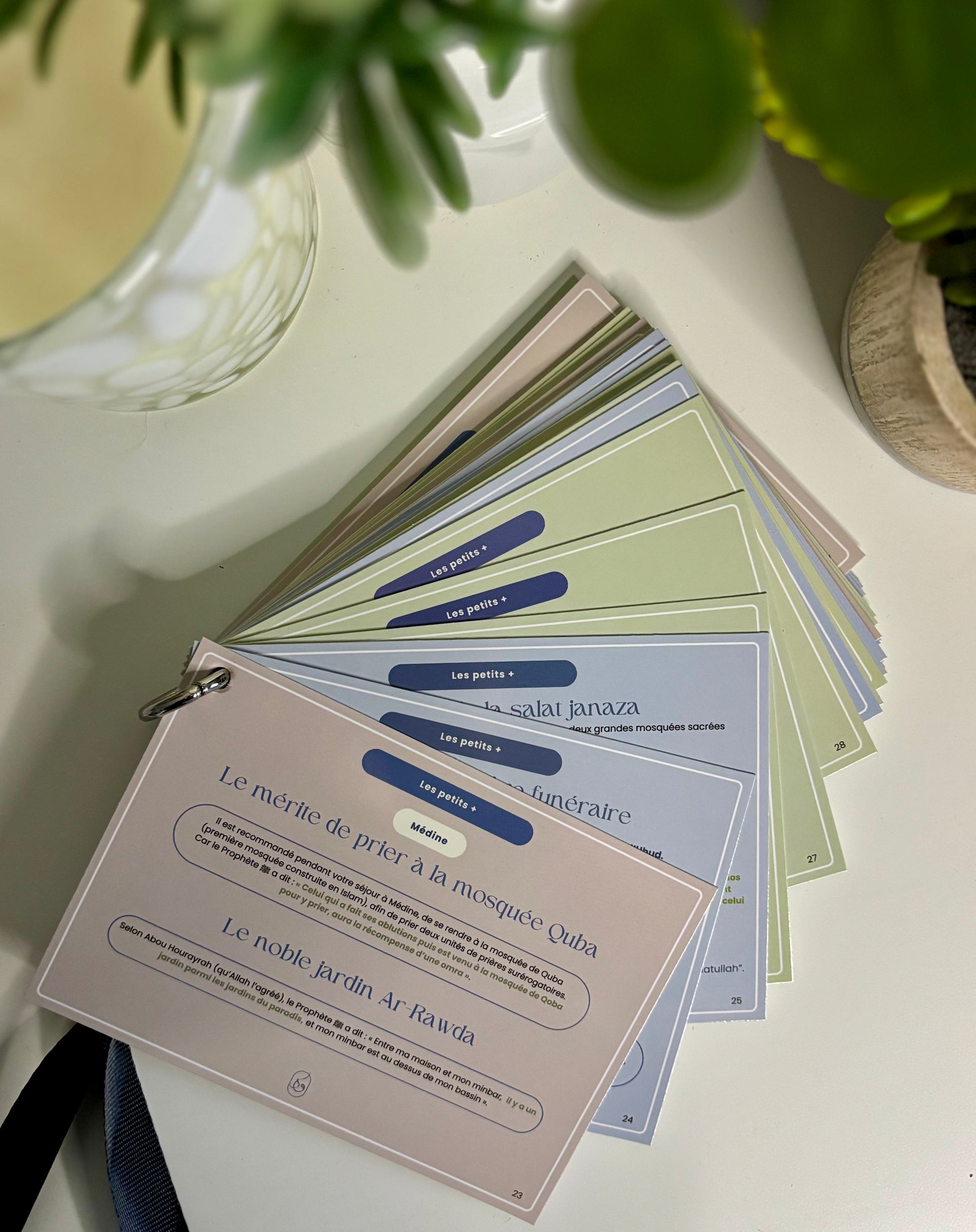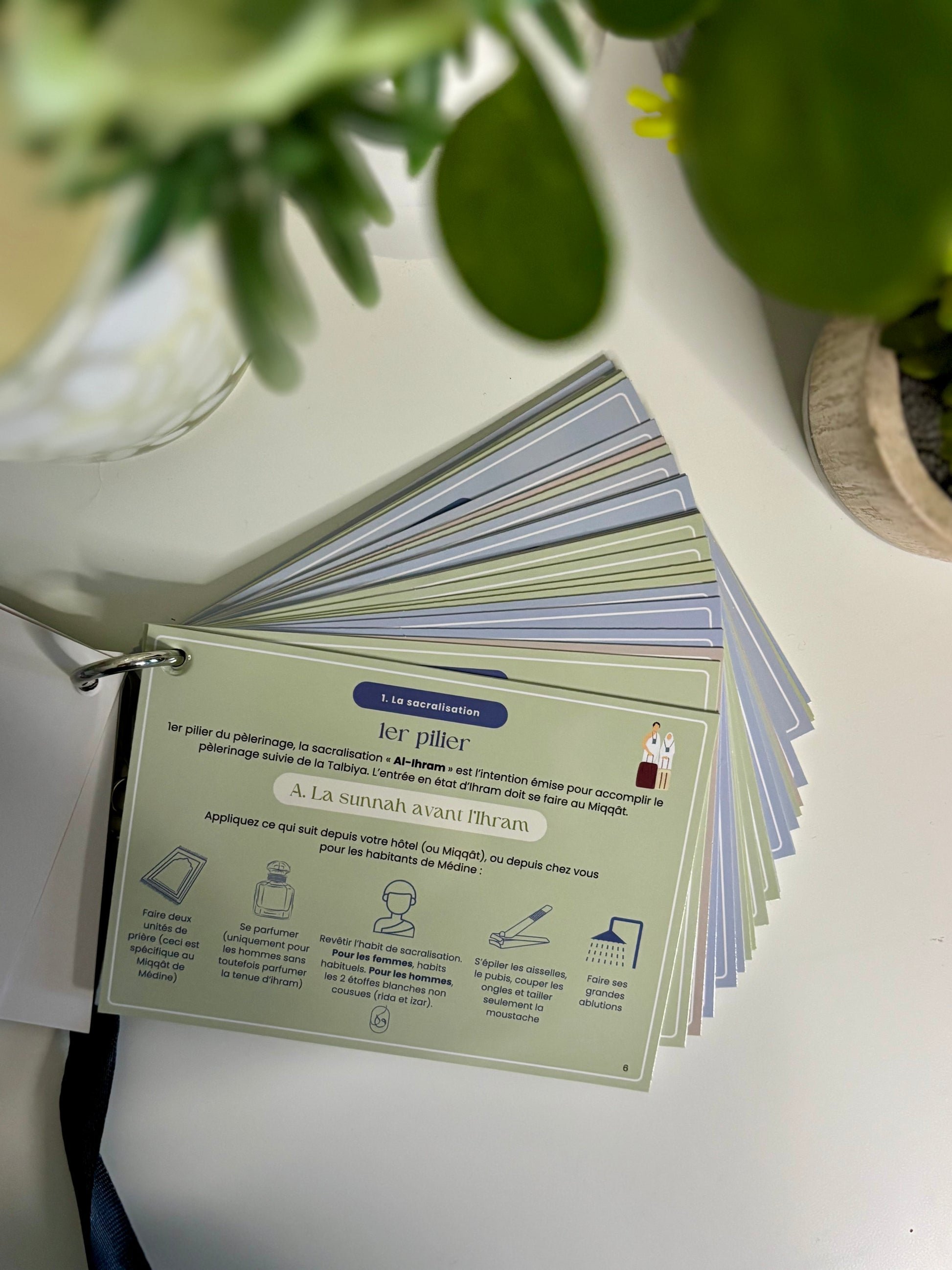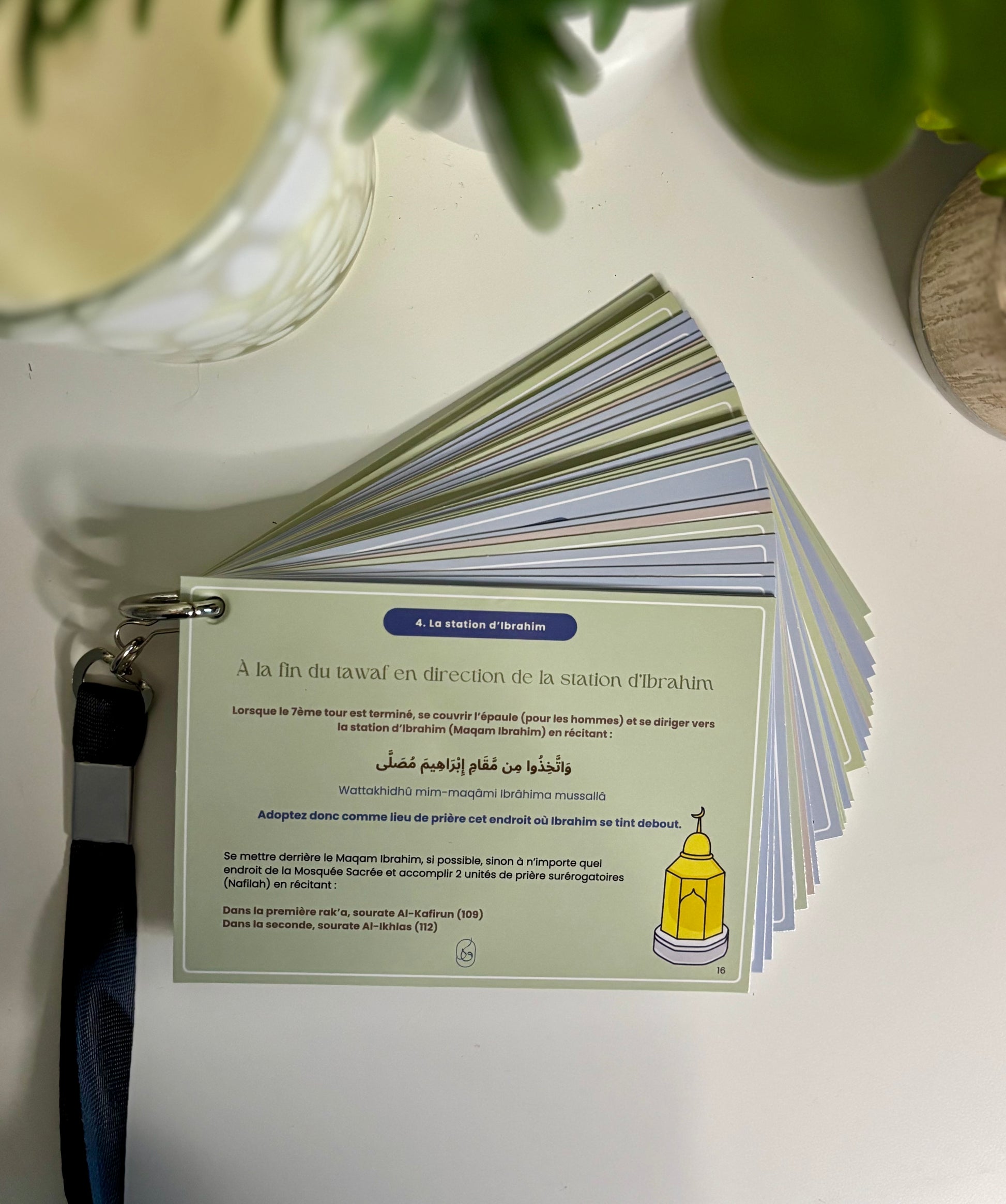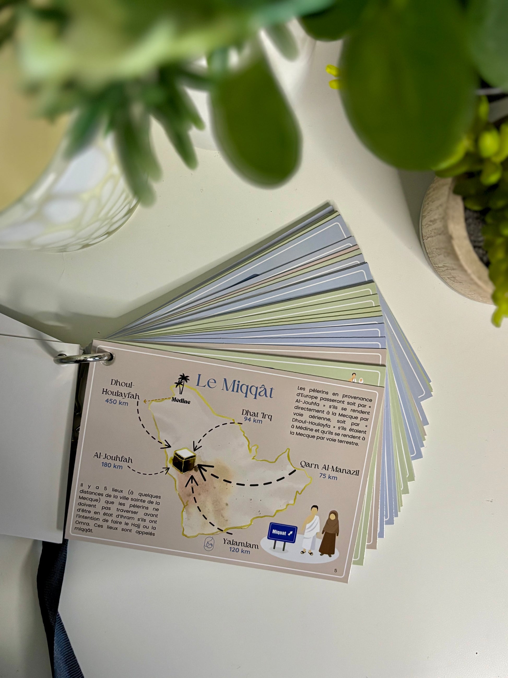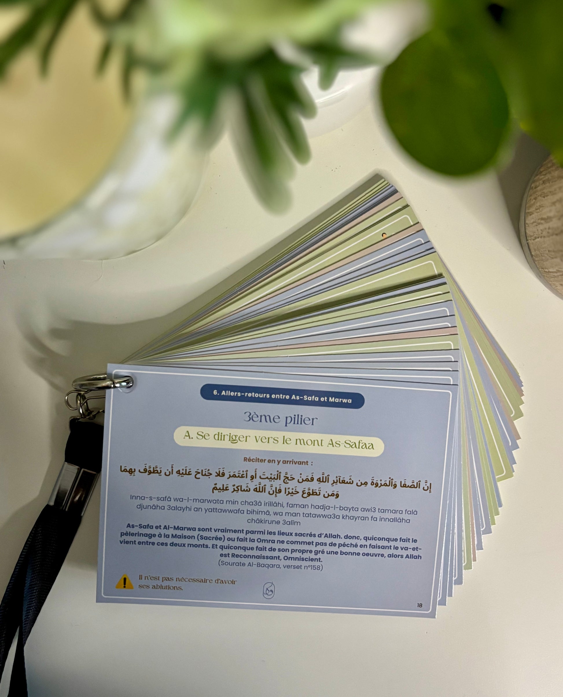 - Un ensemble complet d'invocations organisées par thème et par couleur pour chaque étape de votre voyage sacré, depuis votre départ de chez vous jusqu'à votre retour de la Omra.